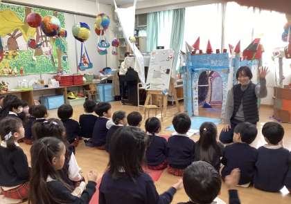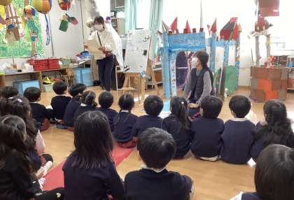 5歳児うめ組ゆり組のお部屋では、先生と子どもたちが、歌を歌ったり楽器を鳴らしたり、ことばを言ったりしていました。さすが年長組さん、みんなで気持ちをそろえています。1月17日にご来賓の皆様をお迎えしてお祝いの会を行います。そのためのおけいこを少しずつ始めています。