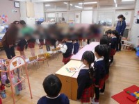 園庭では、手を大きく挙げて、元気いっぱい走り凧揚げを楽しみました。「飛んだよ!」「○○ちゃんの凧めっちゃ高く飛んでるよ!」と嬉しそうな声がたくさん聞こえてきました。風がよく吹いたときには、「走らなくても飛ぶよ!」と大発見した子どもたち。終業式の日には、お家の人も一緒に凧揚げを楽しみましょうね。
