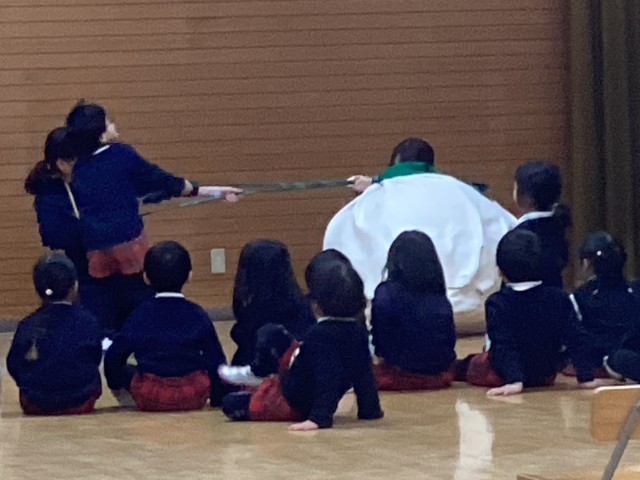 今日は、たんぽぽ組の園内研究保育をしました。今日の活動内容は、「おおきなかぶごっこ遊び」です。活動のねらいは、動物になって体を動かして遊ぶ楽しさを味わう。かぶが抜けた達成感を味わう。ということでした。保育後は、皆で研究協議を行いました。たんぽぽ組の子どもたちがお友達と遊ぶ楽しさを存分に味わっている姿や、大きなかぶを一生懸命引っ張る姿を見て、4月から一緒に生活する中で様々な経験を重ねてきて大切なものがしっかり育まれていることを感じることができました。
