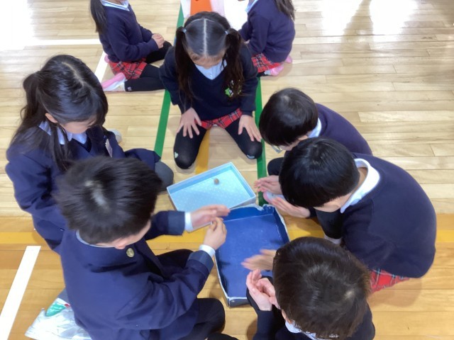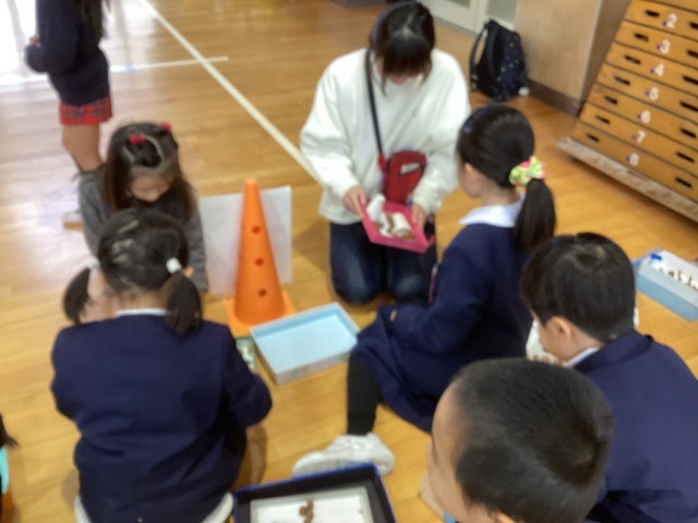 今日は、5歳児うめ組ゆり組の子どもたちが西船場小学校に行き、1年生と一緒に遊びました。講堂に着くと、1年生が自分で作ったおもちゃを用意して待ってくれていました。やじろべえやけん玉やどんぐり転がし、いろいろなおもちゃがありました。新町第二こども園の年長さんも来ていました。「幼稚園の子たちが来てくれるのをとっても楽しみにしていたんだよ」「幼稚園がなつかしいな」と言ってくれる1年生がいました。うめ組ゆり組の子どもたちは、1年生と一緒にたくさん遊んでとても喜んでいました。