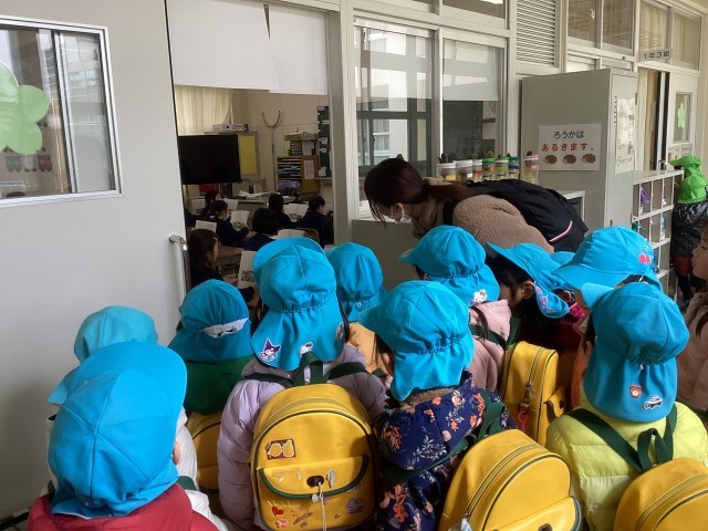講堂で遊んだあと、1年生の教室をのぞきに行きました。机に向かって姿勢正しく座り、国語の教科書の音読をしていました。1年生の様子や教室の中にあるもの、幼稚園の子どもたちにとっては、目にするものすべてが新鮮で、進学後のイメージにつながったようで、4月の入学に期待を膨らませることがでました。西船場小学校の先生方、1年生の皆さんありがとうございました。