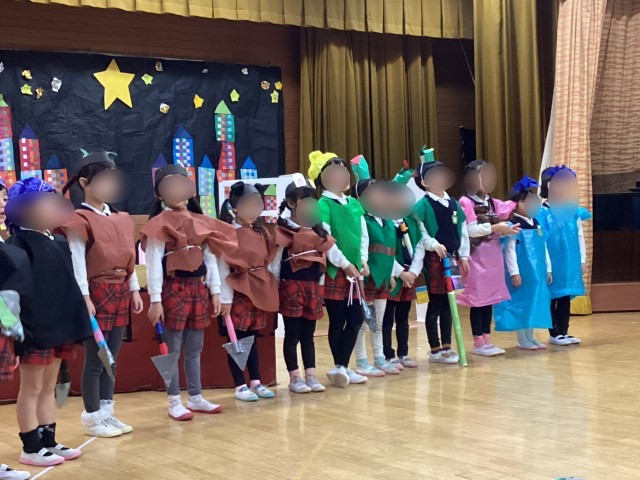 5歳児ゆり組の劇遊びは「ピーターパン」ピーターパンやフック船長、ウエンディーやテインカーベルなどそれぞれの役にすっかりなりきって気持ちをこめて話す姿は素晴らしかったです。お話をよく理解して役の心情を感じて遊んできたのだなということが伝わってきました。みんなで経験を重ねてきた劇遊び、今日はお家の方に見ていただき大きな達成感を味わうことがでました。