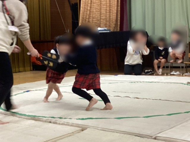 先週から各クラスでおすもうごっこをしています。軍配を手にした先生が子どもたちを呼び出す声が響きます。「ひがーしー○○やまー」「にーしー○○やまー」呼ばれた子どもたちが「はい」と返事をして土俵に出てきます。その後も行司役の先生の合図や声を聞いて、一礼したり、手を組み押し相撲をしたり、かわいいおすもうさんたちが力いっぱい押し相撲をしています。明日大きなおすもうさんの姿を見たらきっとびっくりするだろうなと今からとても楽しみです。