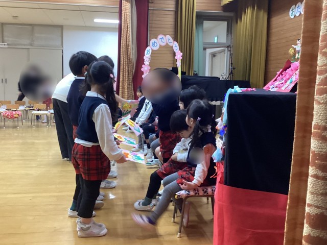 今日は3月のお誕生会をしました。子どもたちが作ったひな人形も飾り、お誕生日を迎えた子どもたちをみんなでお祝いしました。最後に「ハッピーバースデーカーニバル」の曲で遊びました。4月生まれの子が円の中央に出ていき、スキップをして自分の席に戻り、次は5月生まれ 次々出ていくのがとっても楽しそうでした。これでみんなお誕生会を経験してひとつずつ大きくなりました。今日お休みだったお友達には後日プレゼントを渡しますね。