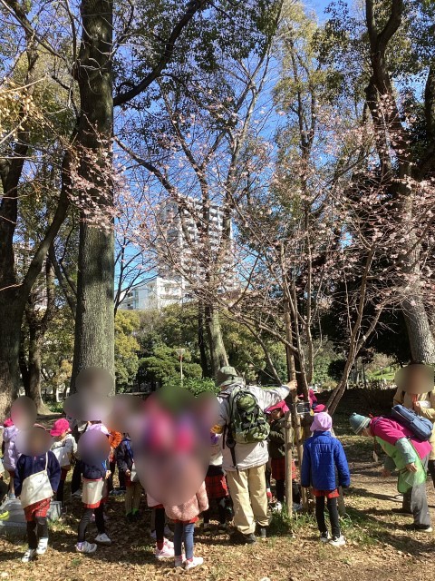 昨日はとてもいいお天気でした。4歳児のばら組すみれ組は靭公園自然研究会の先生たちと自然探検に出かけました。靭公園の自然の中にいると、ワクワクしてきます。これは何かな、と不思議だな知りたいなの気持ちが湧いてきます。ジュウガツザクラが綺麗に咲いています。温かな春の陽射しがキラキラ輝き、風は冷たいけれど春の公園は素敵です。