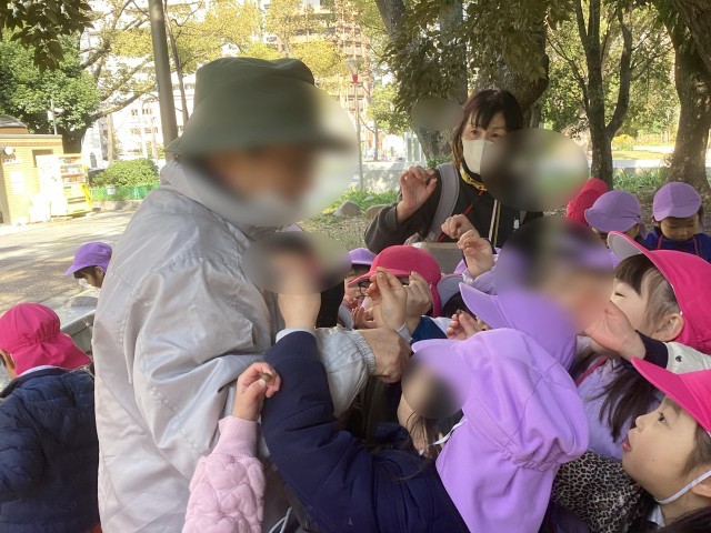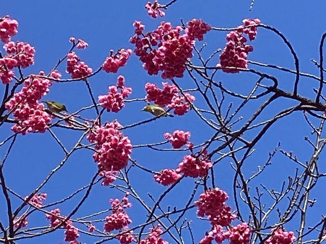この日の自然探検のお楽しみはカンヒザクラを見ることでした。よく見る桜とどこが違うかな と問いかけられて、色が違う お花が下を向いている と答える子どもたち、図鑑や動画で知る自然と 目の前の自然 子どもたちの心の動きはおそらく違うでしょう。
