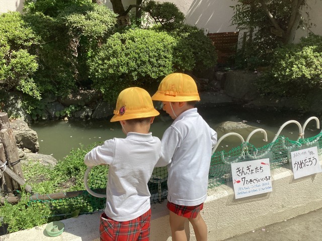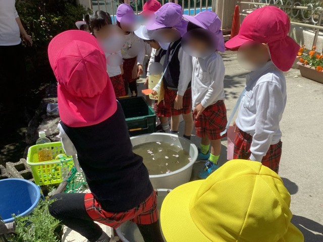 園庭のお池の水が濁ってきたので掃除をしました。水を抜いて、池で暮らしていた金魚やメダカや亀を池の外に置いたたらいにお引っ越しさせていると、子どもたちが次々集まってきました。「何してるの?」「お掃除がんばって」声をかけてくれます。掃除が終わったあとで水を入れて生き物たちを池に戻すと、「気持ちよさそうに泳いでるね」と言いながら池を見ていました。子どもたちが大好きな池の生き物たちがこれからも元気に暮らしていけるようにと思っています。