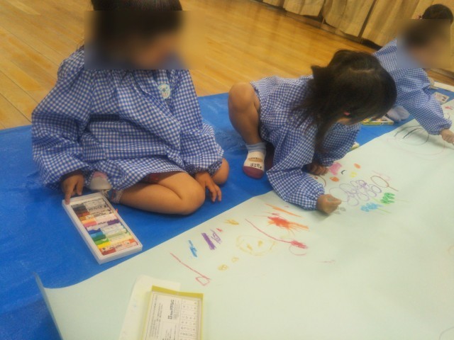 幼稚園で初めてクレパスを使って、大きな紙に絵を描きました。大きな紙を見ると大喜びして、好きな色のクレパスを使って、のびのびと描いていました。何を描いているのか聞くと、「バタバタ飛んでるの(鳥)」「パパ」「にじいろ」などと、自分のイメージを言葉にしながら楽しんでいました。
