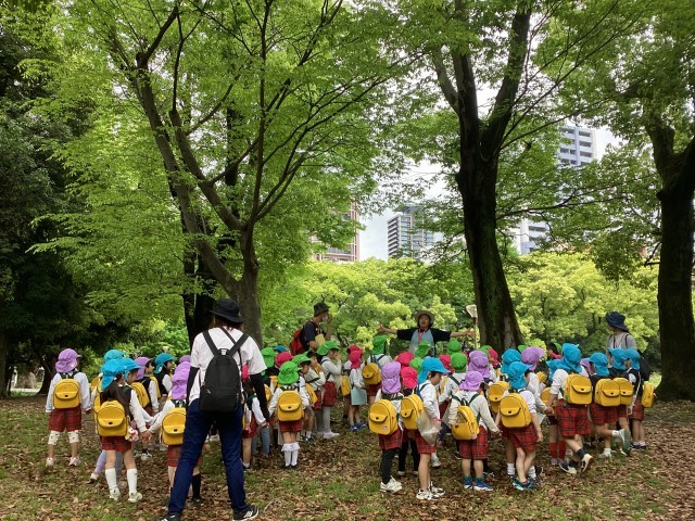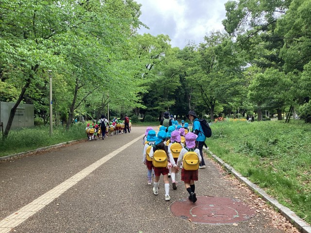 今日は年長組年中組でペアになり、靭公園にお散歩遠足に出かけました。朝一番に出かけたのでとても爽やかで気持ちよかったです。進級してまだ20日なのに、すっかり年長さん年中さんです。靭公園の緑は今日もとっても綺麗でした。