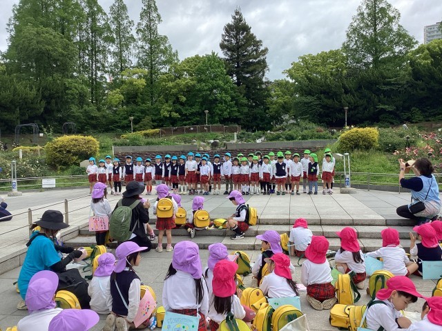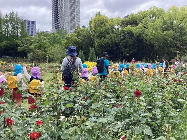 落ち葉がいっぱい、フワフワのベッドみたいと喜んでいました。バラ園のバラがずいぶん咲いてきていて、年長さんが出演するバラ園コンサートの日は、バラの見頃を迎えそうです。年長さんがコンサートと同じ場所に立ち、歌ってみました。年中さんが聴いてくれました。バラ園を訪れていた一般の方も聴いてくださいました。バラ園コンサートは5月9日土曜日です。楽しみですね。