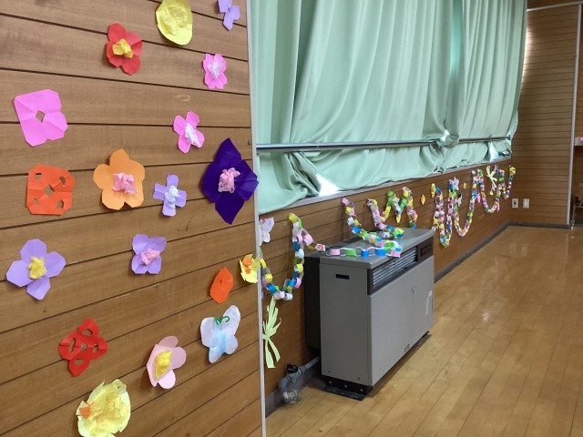 今日はお別れ会、この日のために年中年少組の先生と子どもたちが準備をしてきました。大好きで憧れの年長さんに「ありがとう」の気持ちを伝えるためです。遊戯室の壁いっぱいに子どもたちがつくった飾りがあります。年長組の子どもたちは、遊戯室に入室すると、いつの間に準備をしてくれていたんだろう、とびっくりしていました。