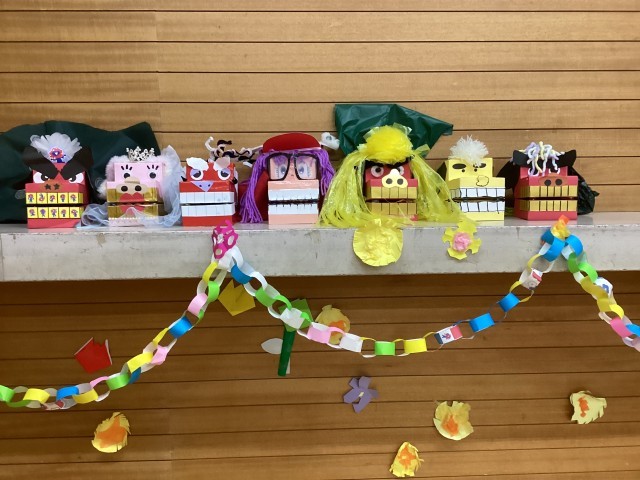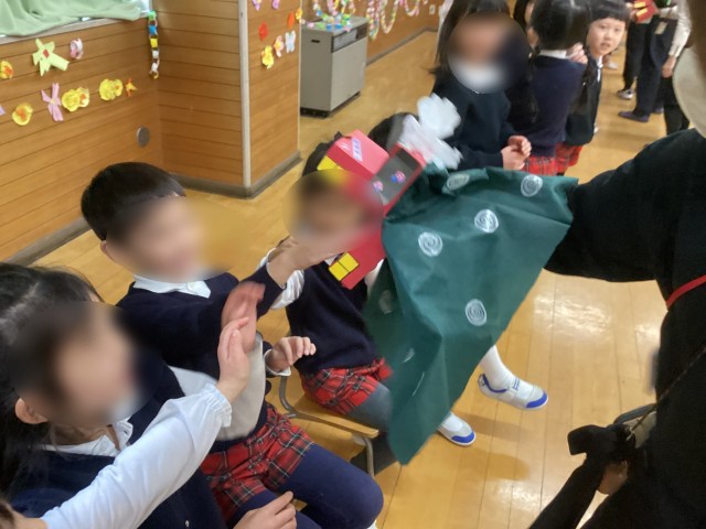 先生たちの獅子舞からは、「うめ組さんゆり組さん、もうすぐご修了おめでとうございます。1年生になっても元気でね」と年長さんにメッセージを伝えました。この獅子舞は、夏祭りの時にお母さん方がつくってくださったものです。年中年少さんからのプレゼントはとっても素敵でした。紙を貼ったり色を塗ったりして一生懸命作りました。クラス写真も貼りました。年長さんに渡せて喜んでもらえてよかってね。