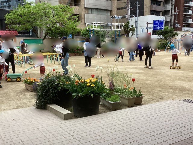 秋に年中組の子どもたちが靭公園の花壇に植えたお花がとても綺麗に咲いていました。子どもたちも喜んでいました。靭公園テニスコート前に、「命の草むら」ができています。いろいろな虫が住める草むらをつくろうというプロジェクト、素晴らしいですね。