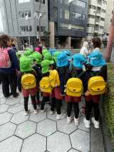 お別れ遠足で靱公園に出かけようとして園庭に並んでいたら、ポツポツ…雨が降ってきま...