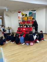 幼稚園の玄関ホールに飾ったおひなさまをじっと見ながら先生のお話を静かに聞いている...