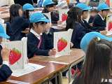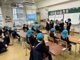 5歳児うめ組ゆり組が西船場小学校に行き、1年生の教室に入り机に向かって椅子に座ら...