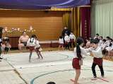 子どもたちと力士さんの取り組み、みんなで力を合わせて押していました。