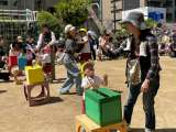 3歳児「どうぶつ遊び」おうちの方と手をつないで音楽を聞きながらお庭を歩く子どもた...