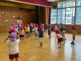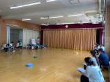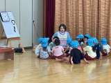 4歳児すみれ組ばら組が遊戯室に集まり「かえるの体操」をしていました。そのあとは先...