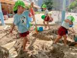 5歳児ゆり組は砂場で穴を掘ったり水を流したりして遊んでいました。裸足になり感触を...