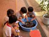 4歳児すみれ組、保育室前のテラスのたらいにダンゴムシがいます。毎日毎日のぞきこん...