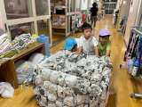 新聞紙と段ボールで作った重い岩を力いっぱい押しています。1人より2人、2人より3...