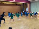 5歳児の子どもたちが ソーラン節を踊っています。涼しい遊戯室で音楽を聞いてリズム...