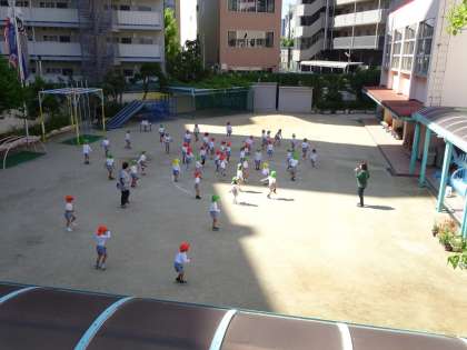 園庭で3クラス一緒に、体操をしたり仲良し遊びをしたりして遊びました。