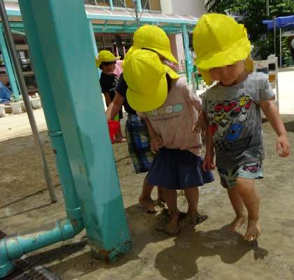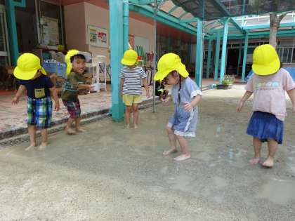 3歳児ひよこ組は、水浸しになった園庭の水たまりにおそるそる足を入れていました。、