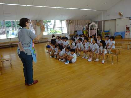今日、中央図書館から「絵本の会」の方がお越しになり、子どもたちに絵本や紙芝居、エプロンシアターなどで、楽しいお話を聞かせてくださいましました。