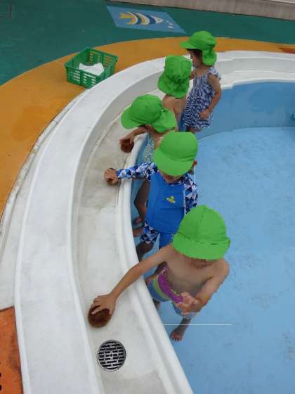 17日、プール開きを前に、5歳児らっこ組がみんなでプール清掃をしました。