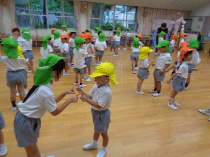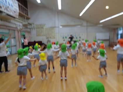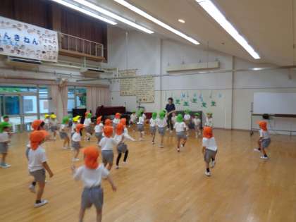 「お外に出られないね」と、子どもたちは少し残念そう。でも大丈夫。幼稚園には広い遊戯室があります。らっこ組りす組ひよこ組が一緒に、体操やふれあい遊びをしました。体操ではらっこ組がお兄さんお姉さん先生になってりす組やひよこ組に教えてくれました。ふれあい遊びでは手をつないで回ったり、触れ合ったりして楽しく遊びました。