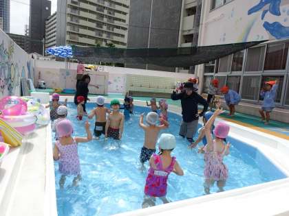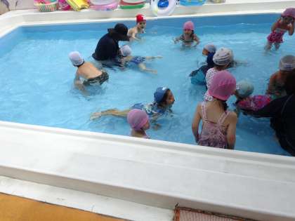 4歳児りす組は、プールの中で「♪エビカニクス」を踊りました。(入水できない子どもたちも、プールサイドでノリノリ♪)