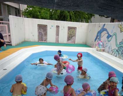 エビ、カニになって、プールの中で踊ると、自然に水が体や顔にかかります。