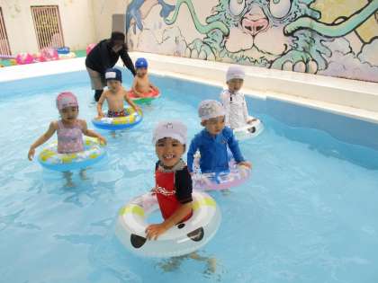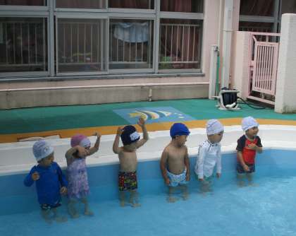 3歳児ひよこ組はプールの中で、体に水をかけたり、先生と一緒に電車ごっこで水の中をお散歩をしたり、プールの端から端を「よーいどん」と元気いっぱい走ったり・・・と水に親しんで遊ぶ楽しさを味わっています!