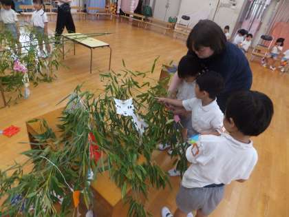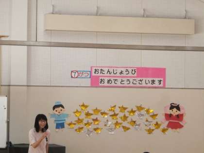 誕生会と七夕の会をしました 公開日 2024/07/04 更新日 2024/07/04 幼稚園日記 7月の誕生会と七夕の会をしました。登園した後、各クラスで作った笹飾りや、各クラスの短冊を、みんなで大笹につけました。誕生会では、七夕のお供え物を見たり、園長先生から七夕のお話を、聞いたりしました。みんなのお願い事も、お星さまに届くといいですね。7月生まれのおともだちも、七夕まつりと一緒にお祝いできてうれしかったですね。 いいね(0)