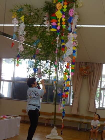 昨日の七夕の会では、大きな笹に飾り付けました。