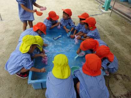 3歳児・4歳児は、水の感触を楽しみながらも、水遊びの遊具を小さな手で一生懸命に洗っていました。