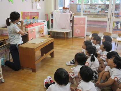 まず、元気に過ごすためには、何が大事かな〜?の問いかけに、年長・年中は、「ごはん食べる!」「お茶・水飲むー!」「帽子かぶる!」「時々日陰に入る!」「手洗い・うがいする!」など色々な回答が返ってきました。これまでの保健指導で話したことや夏の過ごし方で気を付けているようなことをしっかりと覚えており、それぞれに口に出して答えてくれました。
