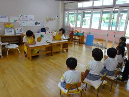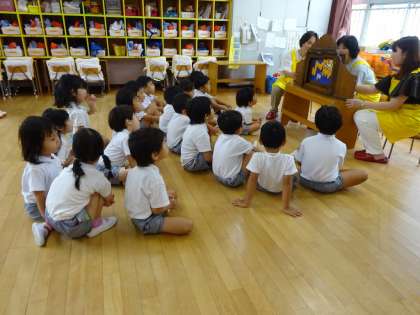 各クラスで、その年齢に合わせたお話を選び、絵本を読んでくださったり、紙芝居を見せてくださったり、絵本によっては、お互いのやり取りを楽めるようにしてくださったり・・・・。