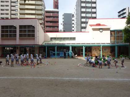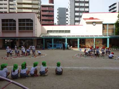 玉入れは、5歳児はクラス内で2チームに分かれて、4歳児・3歳児は合同で2チームに分かれて対戦しましたよ。よーく見てください。4歳児の中に、3歳児の姿が・・・・・