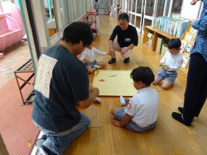 そして、折り紙や紐を巻いてのコマ回しも楽しみました。