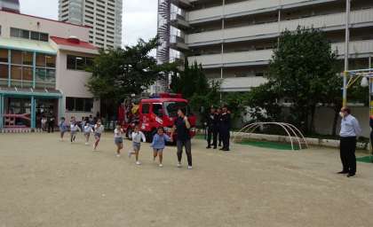 「消防車が来た!」とちょっぴり興奮気味でしたが、避難訓練が始まると、今までのように非常ベルや指示を聞き、消防士さんが見守る中、静かにすばやく避難することができました。