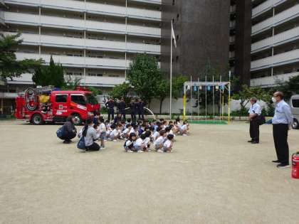 その後、大阪市消防振興協会の方から、火災や安全な避難の仕方を聞き、消防車を見せていただきました。