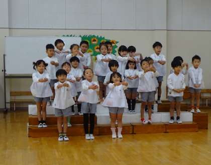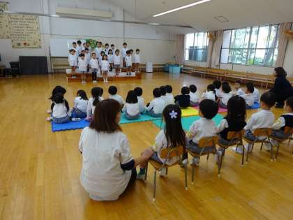 今日、5歳児らっこ組が、4歳児りす組、3歳児ひよこ組、先生たちの前で歌声を披露してくれました。