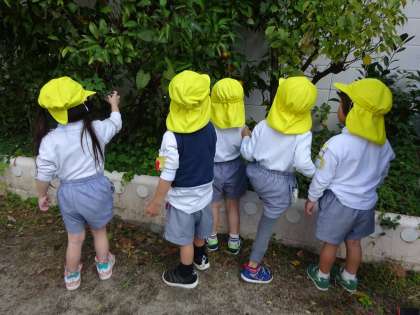 ひよこ組さんは、手が届くところのミカンを自分で選び、「えいっ!」と、自分の力で採りました。そのため、枝のところできれいには採れていませんが(持ち帰ったものを見てくださったと思います)、そこから香るミカンの匂いをずっと楽しんでいました。