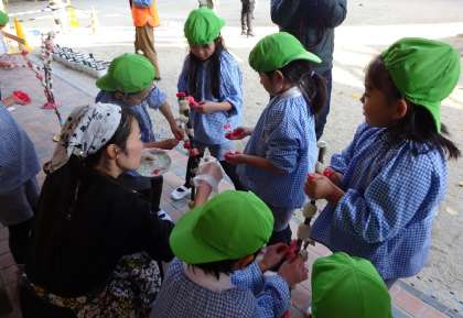ひよこ組、りす組は白いおもち、らっこ組は食紅とませて赤いおもちにしましたが、
