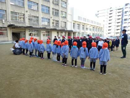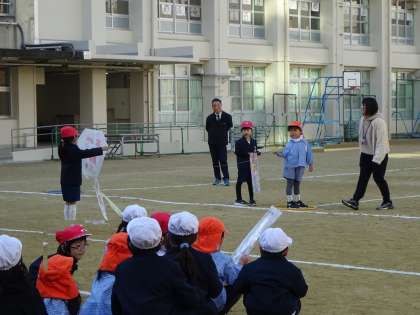 たこあげ(りす組)1 公開日 2024/12/10 更新日 2024/12/10 幼稚園日記 今日、日吉小学校へたこあげに行きました。 ますは、4歳児りす組さん。 小学校へ行くと、1年生が一緒にたこあげをするために、待っていてくれました。 3人で一組となり、りす組の子どもたちのたこがあがるように1年生がスタンバイ! さあ、あがるかな・・・・・ いいね(0)