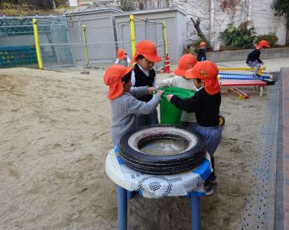 今日、朝は少し雨模様で、その後は晴れ間が見えたものの、とても寒い(冷たい)一日でした。しかし、子どもたちは喜んで園庭に出て、遊び始めました。