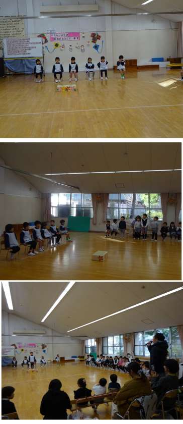 今月から、司会は4歳児りす組です。今まで、5歳児らっこ組の司会ぶりを見てきたりす組の子どもたちは、ちょっぴりドキドキしながらも、らっこ組さんのようにしたいとがんばっていました。